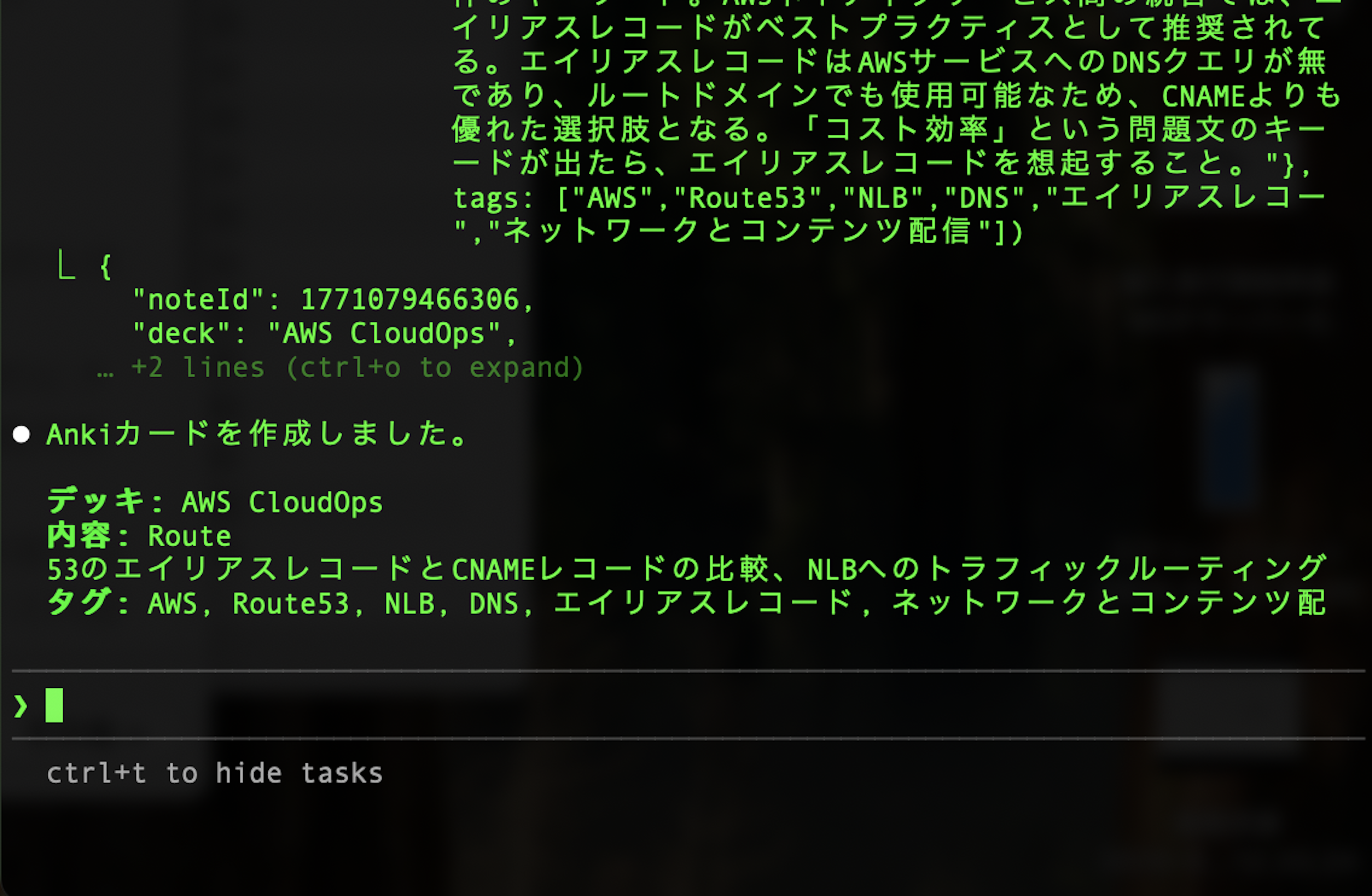 - AnkiConnect API (localhost:8765) 経由で操作あとは問題を解いて問題文と解説文をそのままコマンドラインに貼り付ける。
