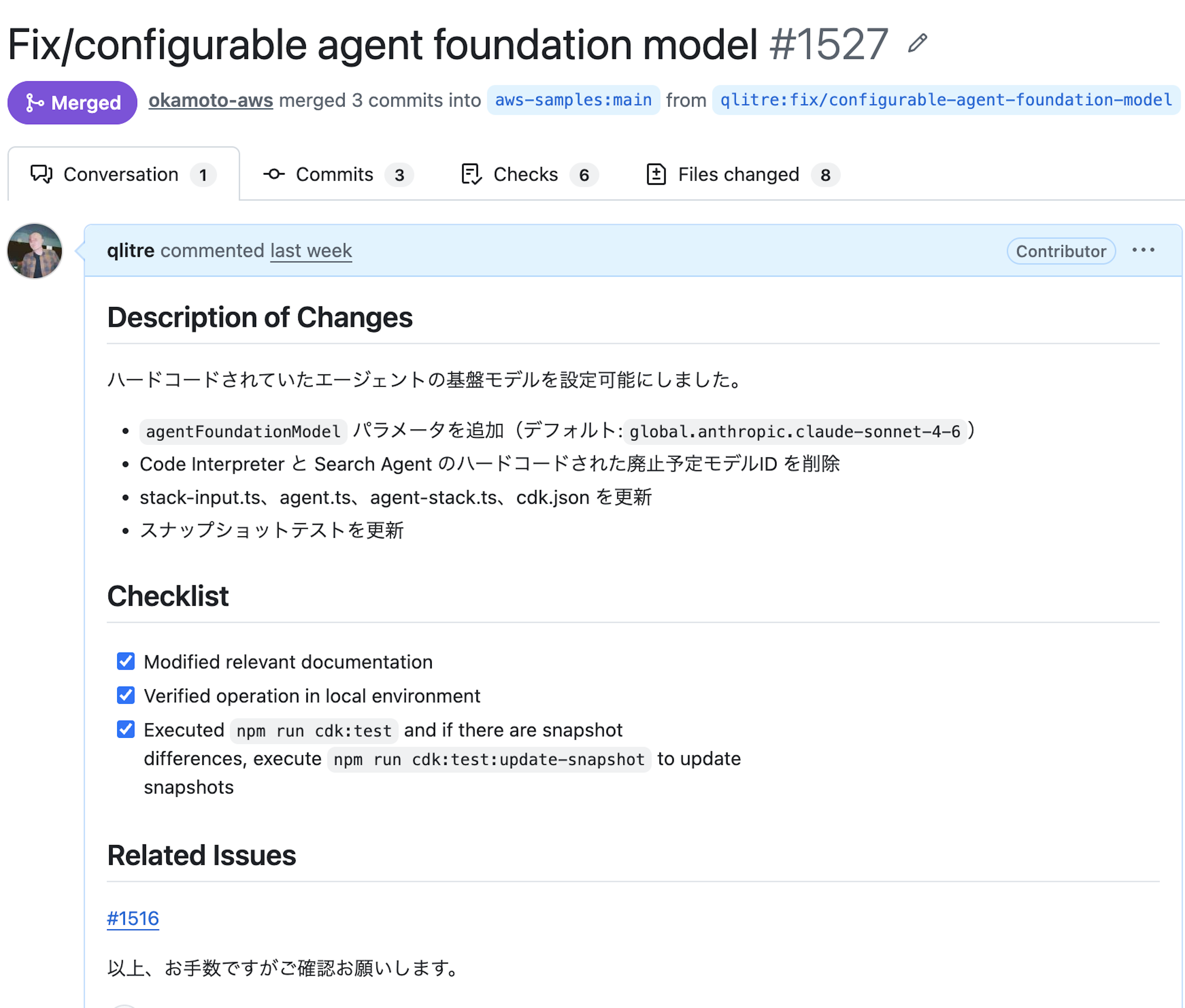 今回はAWSの方がメンテナンスをしているgenerative-ai-use-casesというプロジェクトにコード修正をしてプルリクエストを行った。そういう文脈から今回「初めて」という表現にした。